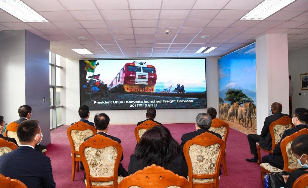 Guests watch a video about 1,500 days of safe operation of the Mombasa-Nairobi Standard Gauge Railway (SGR) in Nairobi, Kenya on July 9, 2021. The Chinese-built Standard Gauge Railway (SGR) linking Kenya's port city Mombasa to the capital Nairobi is celebrating 1,500 days of safe operation as it seeks to boost the safety of passengers and cargo along the 480 km corridor. (Xinhua/Li Yan)