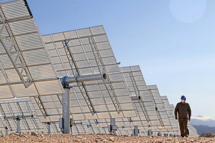 An employee inspects photovoltaic panels at a solar power plant in Hami prefecture, the Xinjiang Uygur autonomous region, in September. [Photo by Cai Zengle/China News Service]