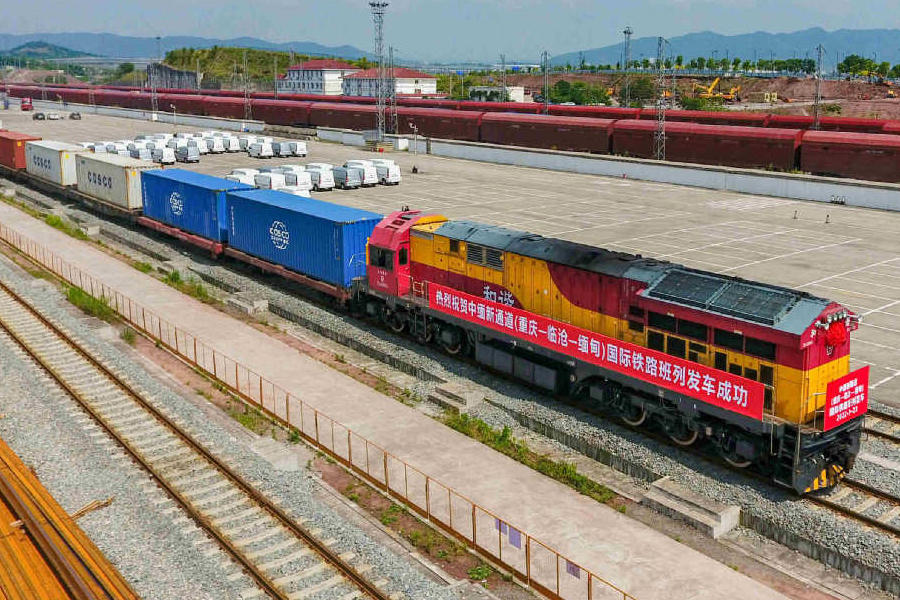 A train fully loaded with 60 containers of mechanical devices, electronic components and auto parts departed on Monday from Chongqing. It will arrive in Lincang, Yunnan province, and then the cargo will be transported to Mandalay, Myanmar, by highway in 15 days, marking the opening of a new international rail service between inland China and the Southeast Asian country.